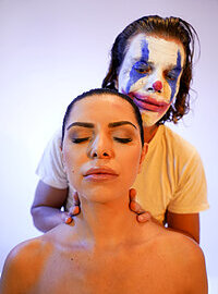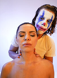 Movie description: "Joker gives wonder woman a massage". It's time for an especially spooky scene when top masseur, Ricky Rascal, gets inspired by a popular new film and paints his face like a clown for his session with busty babe, Kira Queen. Ricky covers Kira's eyes and leads her to the table, then pours oil into his hands and rubs Kira's neck and shoulders. Sliding his hands down the front of Kira's body, Ricky slowly encircles the curves of Kira's big boobs, then lies her down. Stripping himself naked, Ricky introduces some mood lighting, then works his way between her thighs so he can eat her pussy. Once Kira is wet, Ricky sticks his hard cock inside of her, then fucks her pussy as she moans in delight. Ricky pounds Kira's pussy, then she sucks his cock, then he goes back to fucking her doggystyle on the table until he creampies her!