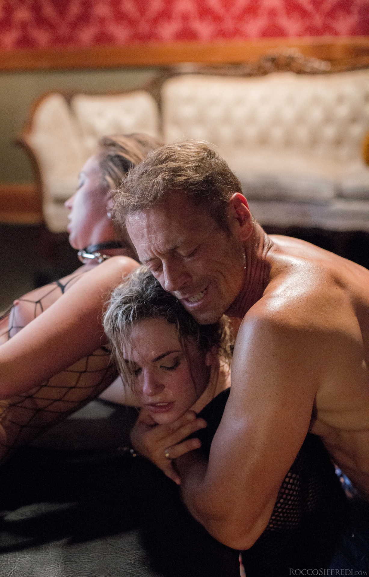 Photos description: "Orgy: Oral Worship X Harsh Domination". Legendary Rocco Siffredi and his classic muse, buxom British blonde Kelly Stafford, explore the freaky, psychosexual crosses they bear. A visually striking orgy in a European mansion features Rocco, Kelly and porn rebel James Deen harshly dominating fishnet-clad sluts Maddy O'Reilly and Dahlia Sky. The girls provide slobbery oral worship amid gagging, choking breath play, slapping, spanking, hair pulling and foot sucking. Collared, leashed Maddy rides James' dick as Kelly rims her. The scene starts with Kelly dramatically splayed on a cross; by the end, she has naked Rocco bound to the cross as Dahlia sucks his load into her mouth.