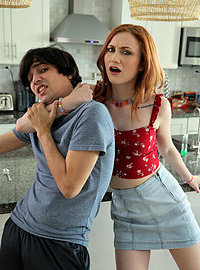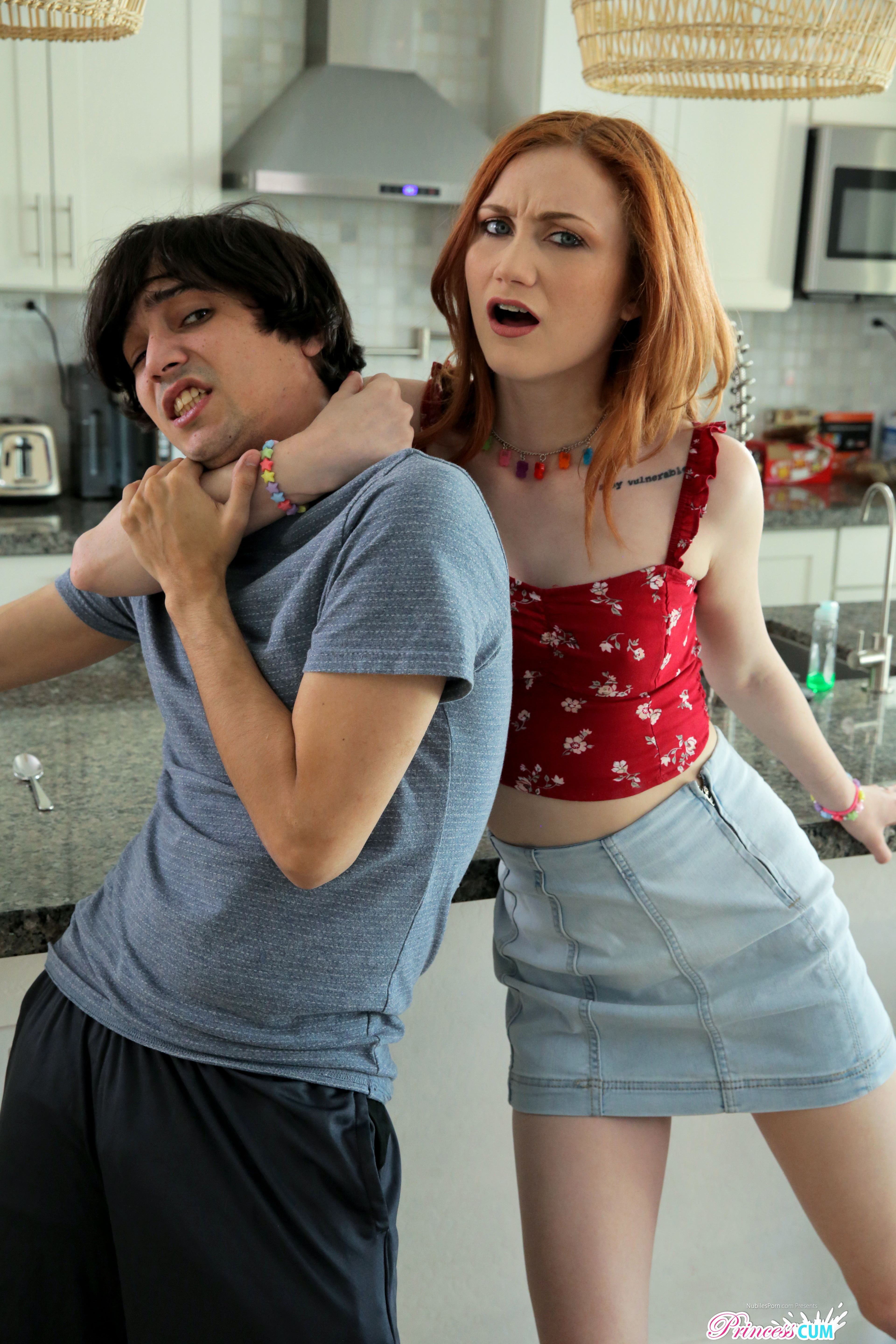 Photos description: "Whats Mine Is Hers - S6:E3". Scarlet Skies has a bit of a rivalry going on with her stepbrother, Ricky Spanish, but she thinks she has a trump card to play the next time they go head to head. Sure enough, Scarlet walks in and sees Ricky eating cereal. She wants what he's got, so she takes it and then flashes her firm boobs at him to scare him off from retribution. Satisfied that her tit trick worked, Scarlet waits until the next morning and tries it again. This time, though, Ricky is prepared for her. When Scarlet tries to get her way with her boobs, Ricky pulls his dick out. Too bad for Ricky that Scarlet doesn't care. She leans forward, boobies still out for the world to see, and starts eating his cereal. Frustrated, Ricky tells Scarlet that if she's gonna sit there like that, he's going to fuck her. Scarlet calls his bluff, so Ricky strokes himself to peak hardness and then lifts Scarlet's miniskirt and sticks it in. Scarlet likes it, although she tries her hardest to hold the moan and act indifferent. Eventually as Ricky settles into a good doggy style rhythm, Scarlet can't pretend any longer that she's not loving her stepbrother's dick. She eventually lets him pull out and says that she'll fuck him right if he promises to cum inside her. Then takes his hand to lead him to the living room so they can really go to town on the couch. Once Scarlet gets Ricky seated on the couch, she hops aboard to show him what fucking her can truly be like when she's an eager participant. Climbing off Ricky's dick, Scarlet takes her time delivering a sloppy BJ where she slurps her own juices from her stepbro's shaft. Then she gets on her side and turns her hips so she's nice and open for Ricky to reenter her rom a position of power. Scarlet is with Ricky all the way as she finishes on her back and then begs him to keep his promise and cum inside her. When he does, Scarlet confirms that she isn't on birth control and that he might have gotten her pregnant.