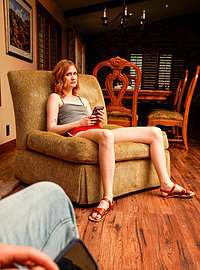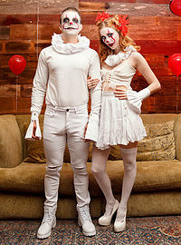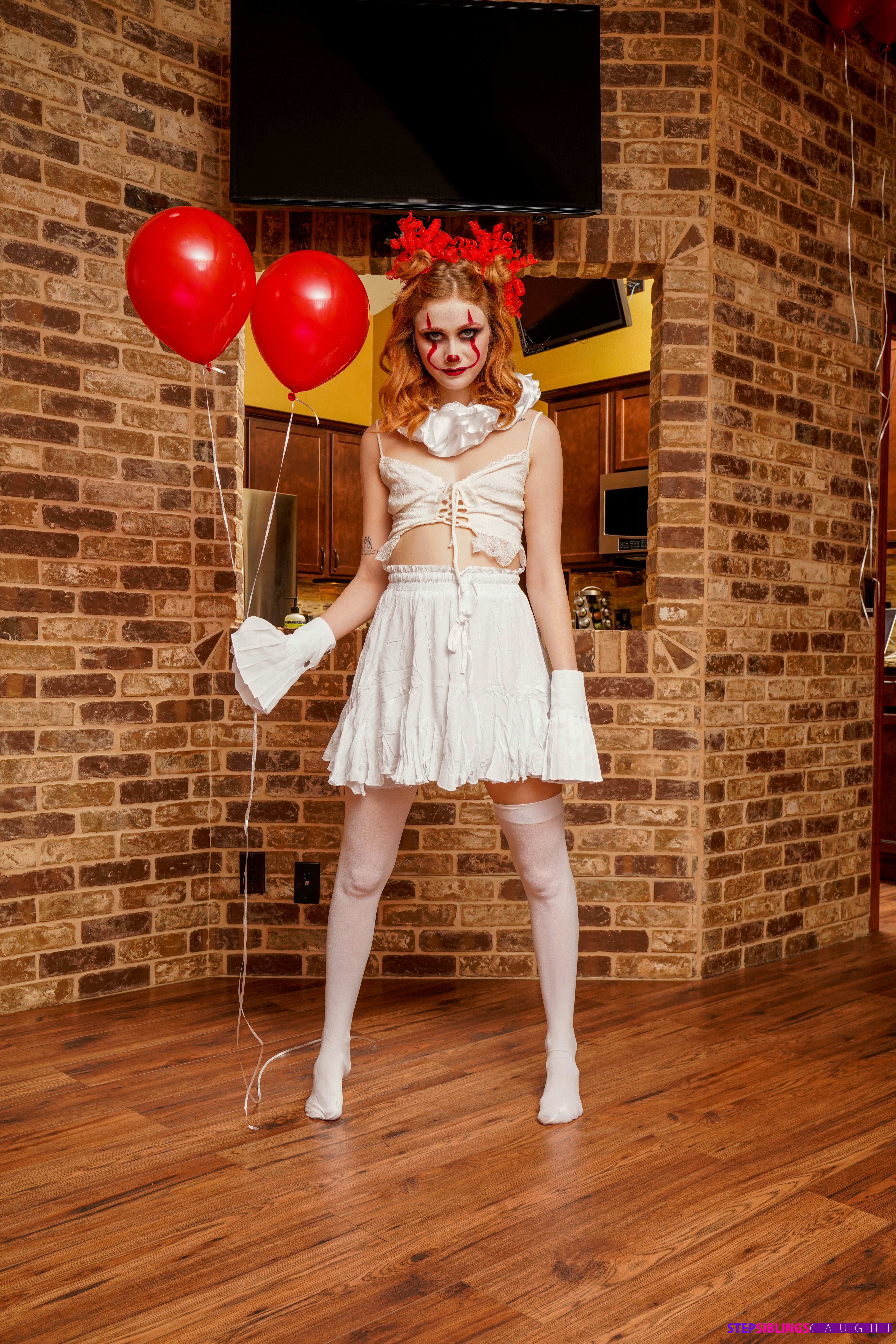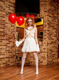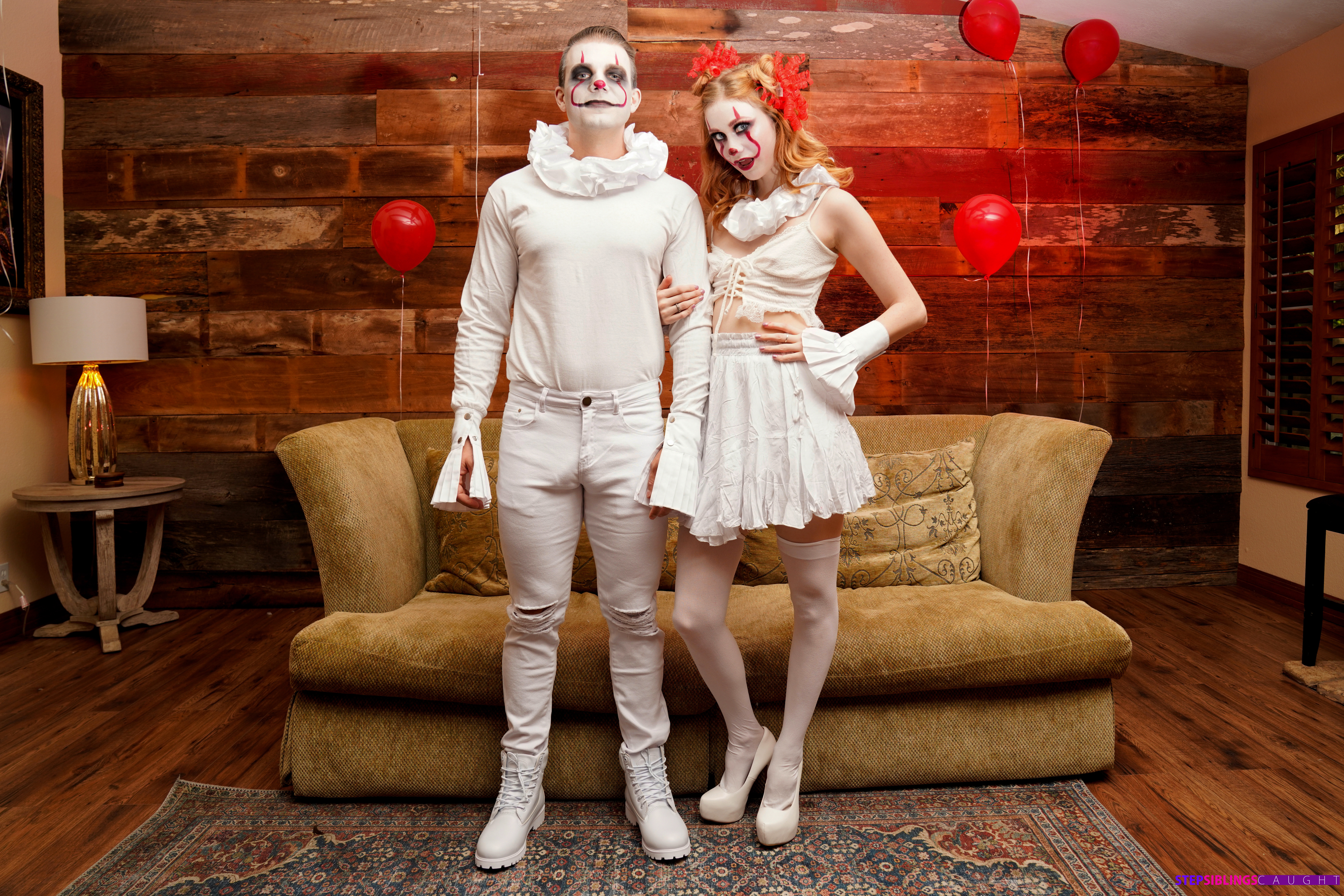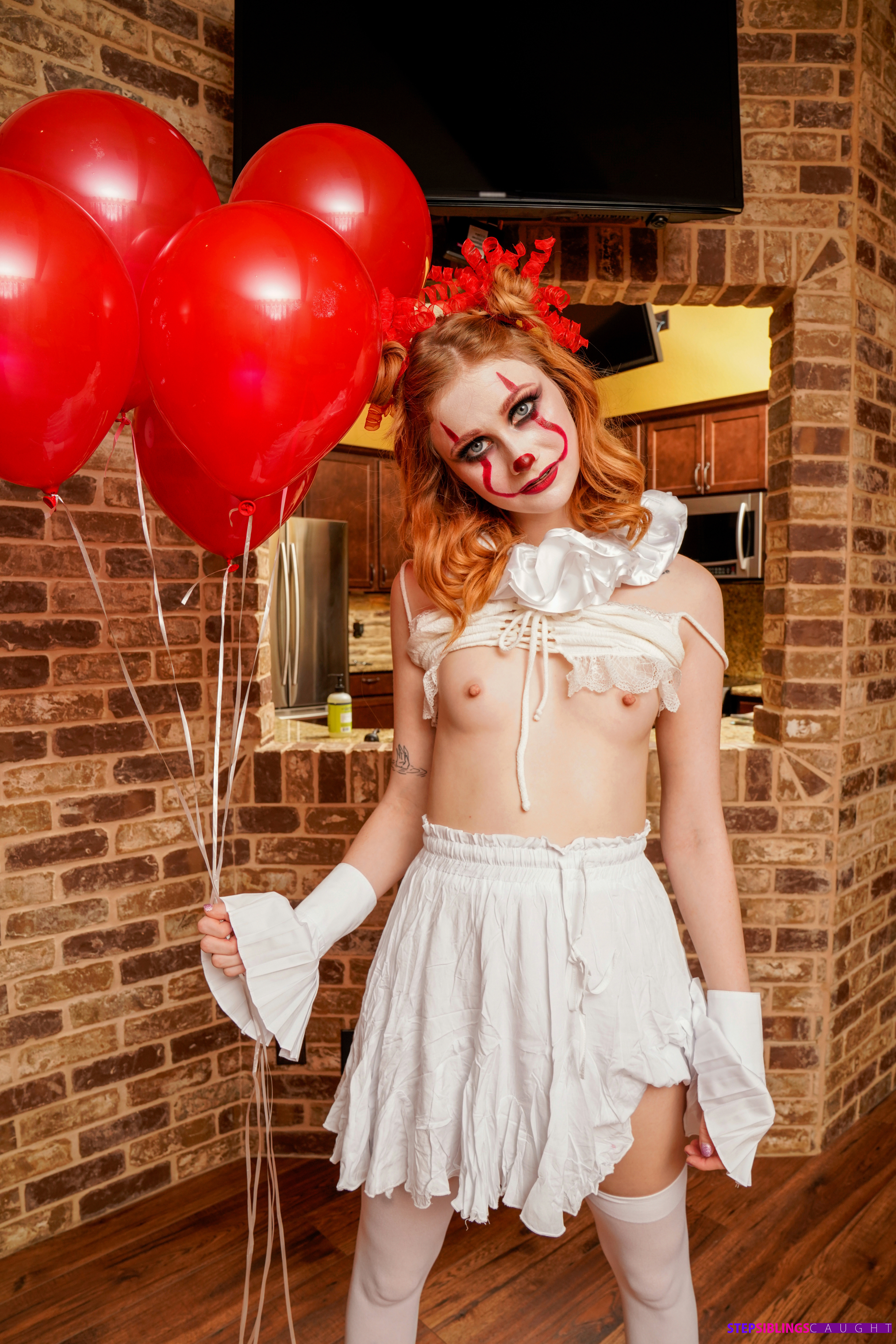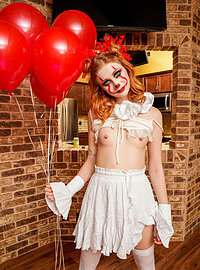 Photos description: "Stop Clowning Around Stepsis - S18:E9". Codey Steele and his dad have just moved in with Scarlet Skies and her mom. Codey and Scarlet have not really figured out how to coexist comfortably yet, but with Halloween just around the corner at least they have something to talk about. Scarlet wants to dress as a famous evil clown, but Codey poo poos her idea. Taking off in disgust, Scarlet puts on her sexy clown costume and then tries it out on her new stepbrother. Codey doesn’t seem phased with Scarlet’s initial appearance, but Scarlet isn’t done being a total creeper yet. She follows him around the house with her red balloons, making sure he catches peeks over her but not for long enough to be sure she was really there. When Codey lays down for a nap, Scarlet crawls on top of him and just stares down. Codey wakes up to a spooky clown face staring right at him. Once her stepbrother sees her, Scarlet comes on to him hard. She grabs his hand to drag his fingers through the slit of her pussy, then tugs his pants down to go to work sucking him off. Codey wasn’t looking for sex with his brand new stepsister, but Scarlet insists. She crawls up his body and sinks down onto his fuck stick to rock her hips and ride him in a rhythm that quickly gets her moaning. Codey eventually sits up and helps Scarlet as she slides back on top of him, this time with her back to his chest. When she climbs off and gets on her hands and knees in an invitation for Codey to do some of the work, he takes her up on it. Getting to his knees, he slams home into Scarlet’s cock loving snatch and goes to town giving it to her in doggy. Scarlet loves the way her stepbrother fucks and she demonstrates her excitement by rocking back into every one of Codey’s enthusiastic thrusts. When Scarlet rolls onto her back, the horny redhead brings her knees up to her chest to spread herself wide open so that Codey can go to town eating her out and then replacing his tongue with his cock. Codey is so wound up he can’t stop until he has delivered a deep creampie into Scarlet’s hot little twat, a Halloween treat that she loves to lick off her fingers.